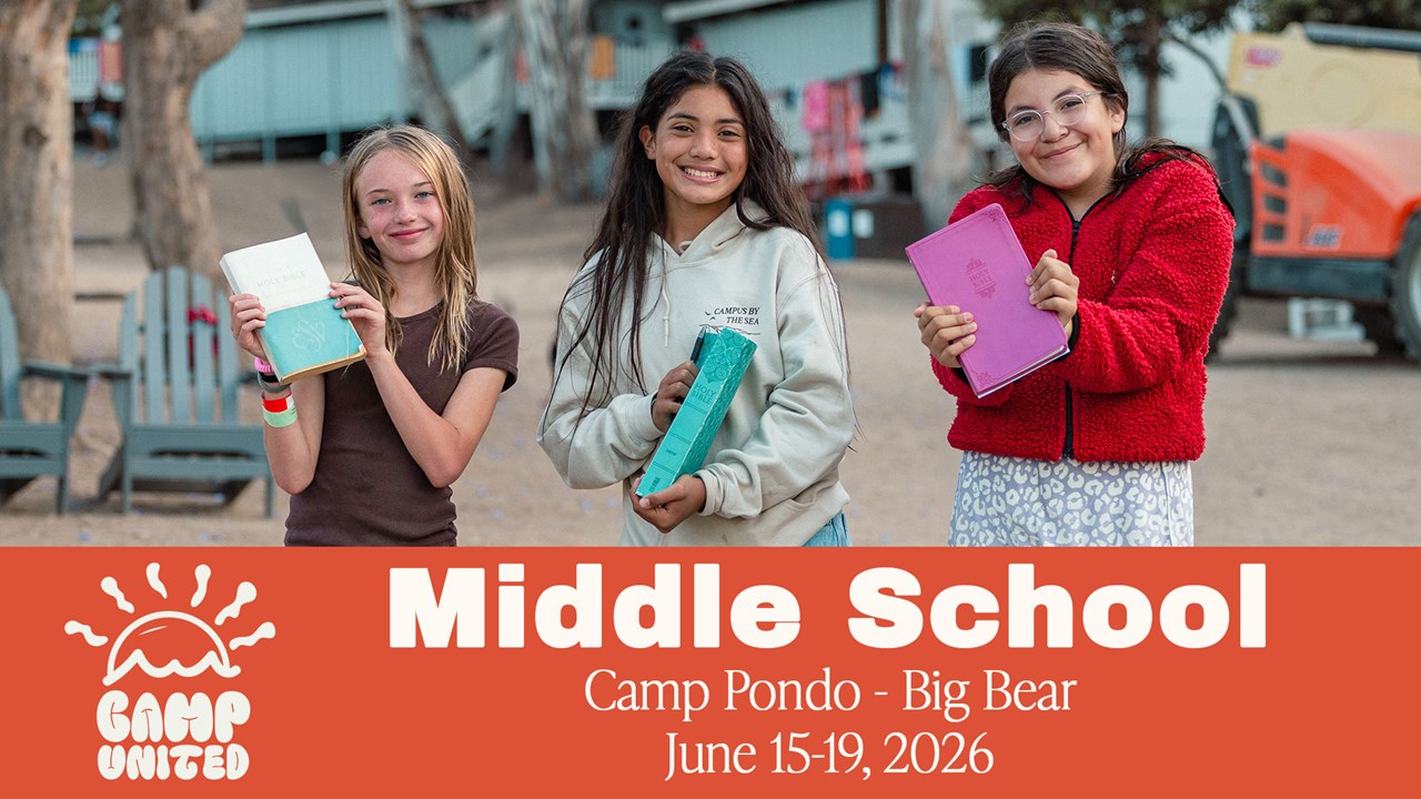 Middle School Camp United is a five-day experience designed specifically for Middle School students who want to grow in their faith, build strong friendships, and step away from the noise of everyday life. We are heading to Camp Pondo in Big Bear for powerful worship, practical teaching, small groups, and intentional time that helps students take their faith deeper.